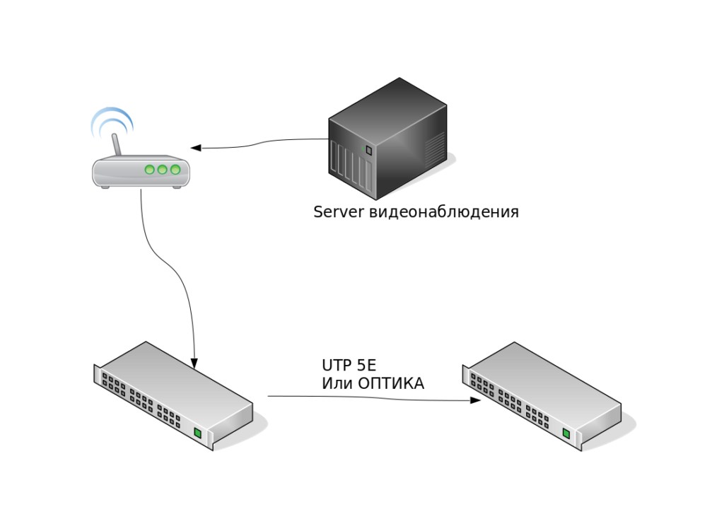 На изображении мы видим подключение IP видеокамер к коммутатору. Если видеокамер больше чем количества портов на коммутаторе, то следует установить два или несколько коммутаторов. В этом случае необходимо подключить связь между коммутаторами кабелем витая пара не ниже 5 категории. Если расстояние более 100 метров между коммутаторами, то требуется прокладка кабеля по оптике (оптоволоконный кабель).