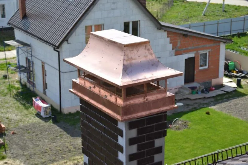Изготавливают колпаки из материалов, устойчивых к разрушительному воздействию погодных явлений. Это изделие закрепляется в очень труднодоступном месте, так что лучше не экономить, и приобрести нержавеющую сталь или листовую медь.