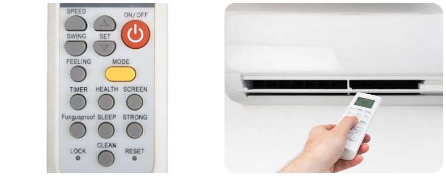 Кондиционер, установленный в жилище, можно переключать на обогревающий или холодный режим работы, в нем включают сушку или вентиляцию. Для выполнения таких действий есть кнопка MODE, позволяющая очередным нажатием изменять режим.