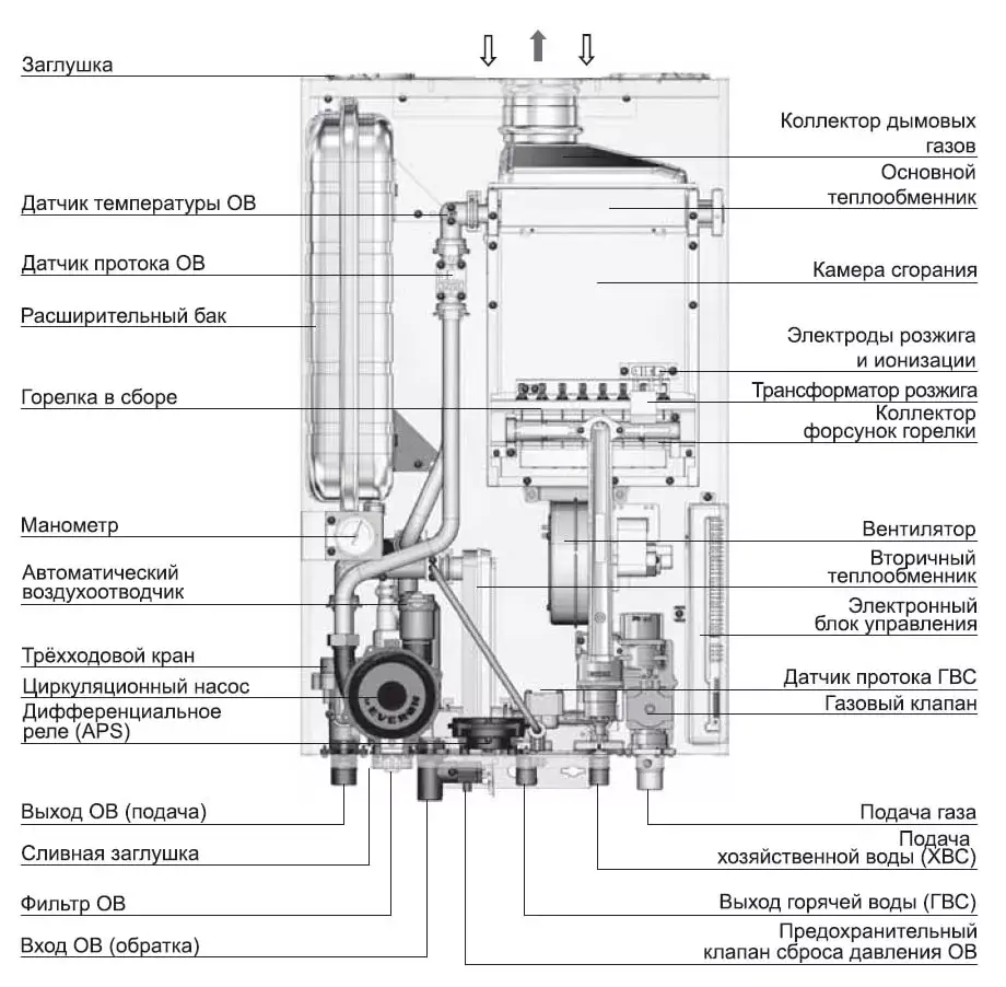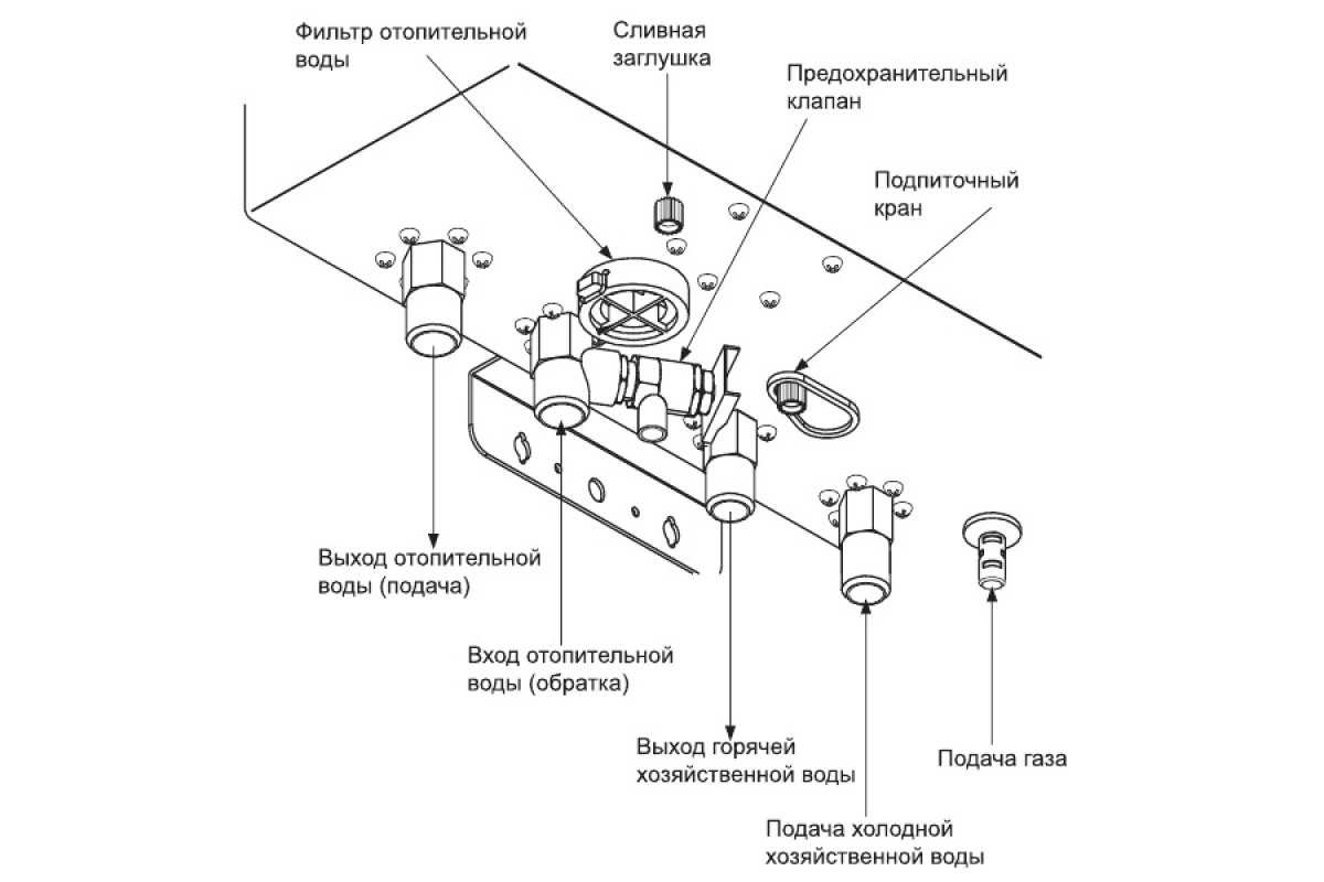 В нижней части котла располагаются входы и выходы контуров отопления и ГВС, кран подпитки, сливная заглушка, фильтр очистки и предохранительный клапан сброса избыточного давления.