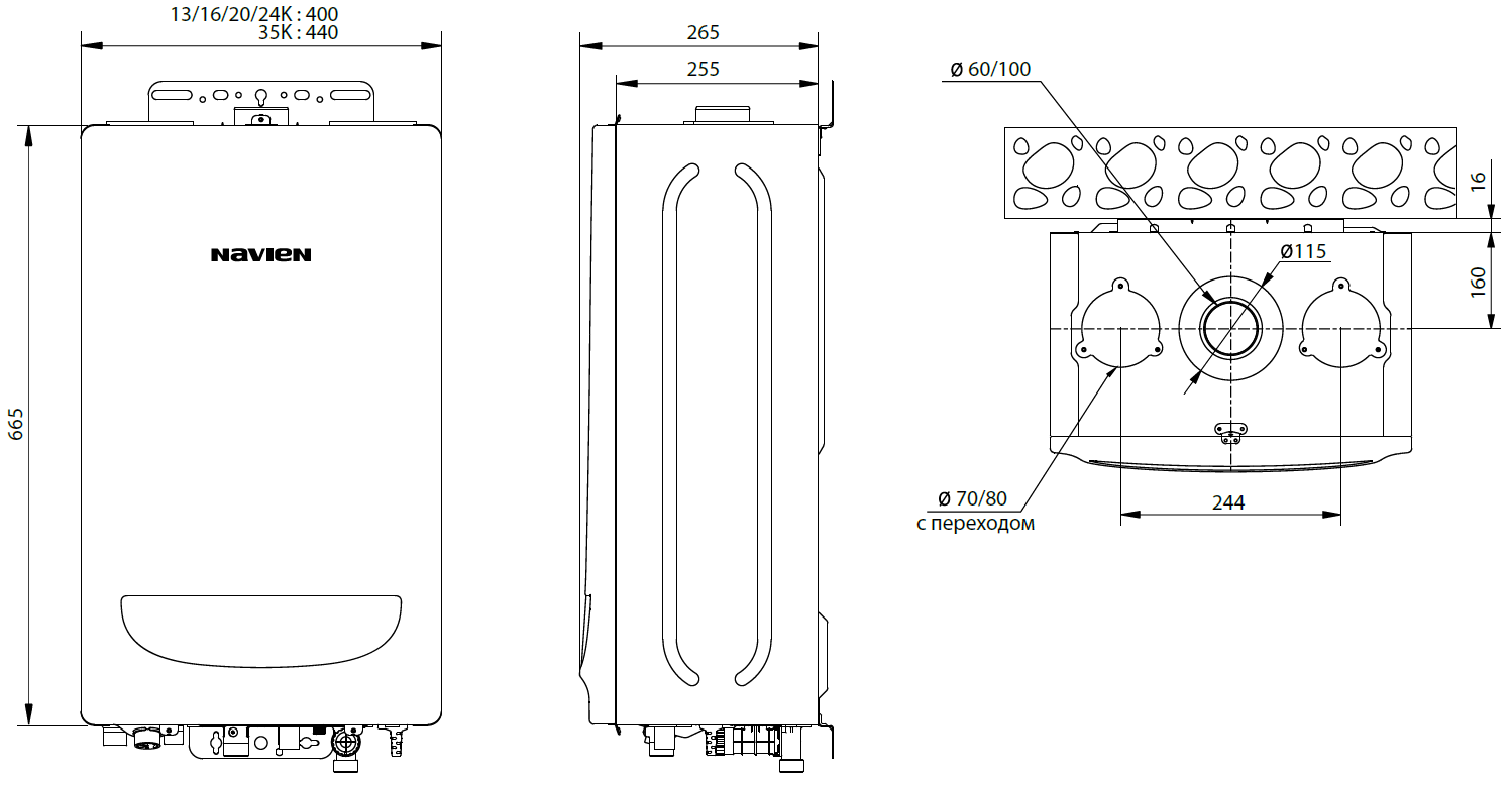 Примечательно, что в котлах Navien нет встроенной панели управления. Все регулировки осуществляются с помощью отдельного пульта управления. Также пульт снабжен датчиком температуры и отображает различную информацию о состоянии работы оборудования и сообщит о возникшей неисправности кодом ошибки. Особенностью Navien также является наличие датчика давления воздуха, который осуществляет не только функцию проверки тяги, но и отправляет на блок управления данные для порционного контроля и определяет наличие обратной тяги. Если в дымоходе есть избыточное давление, например, вследствие задувания ветра подача газа на горелку будет прекращена и котел остановится.