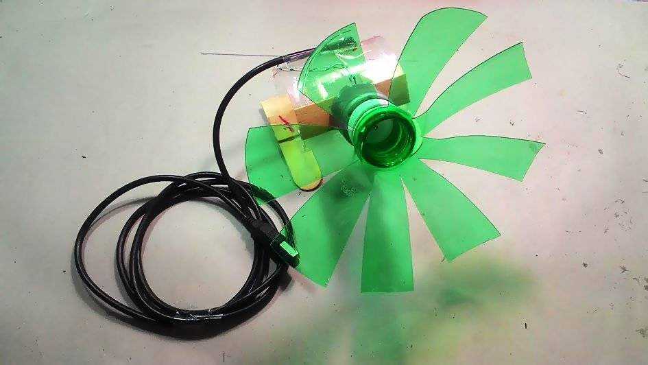 Тут, как и в предыдущем варианте, все зависит от Вашей фантазии. Из всех подручных средств вариант с проволокой наиболее подходящий. Когда самодельный USB вентилятор будет готов, подключаем провода моторчика к проводам шнура, тщательно изолируем скрутку и переходим к испытательным работам.