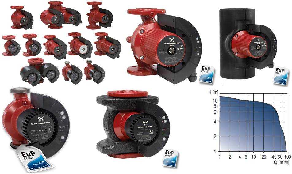 Grundfos Magna3 – в серию входят как небольшое циркуляционное оборудование, так и промышленные станции, нагнетающие, имеющие пропускную способность 70 м³/час, напор водяного столба до 18 м, и максимальным напором 16 бар.