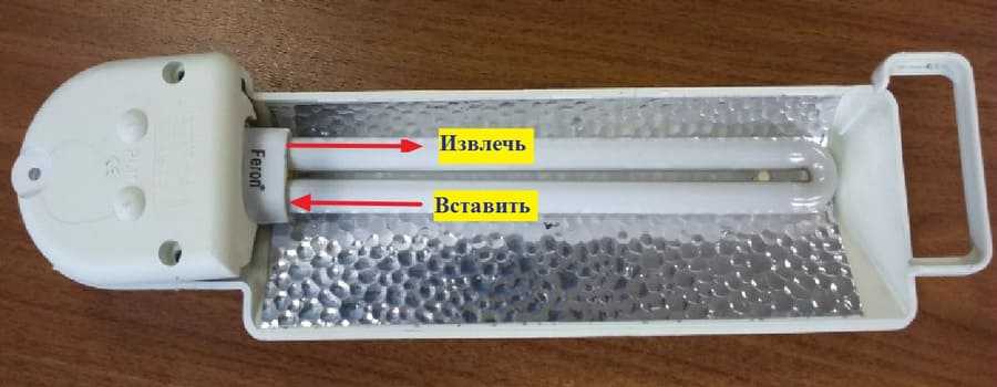 - Лёгкими движениями расшатывания вытягивают люминесцентку из разъёма;