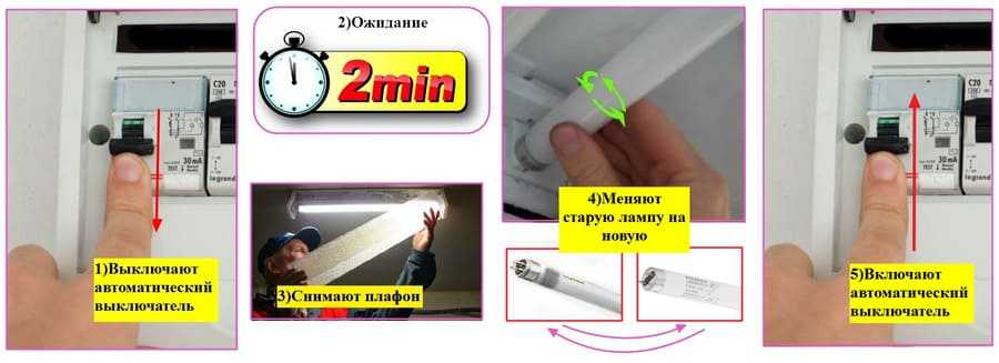 Процесс, как поменять сгоревшую лампу дневного света в светильнике, примерно такой: