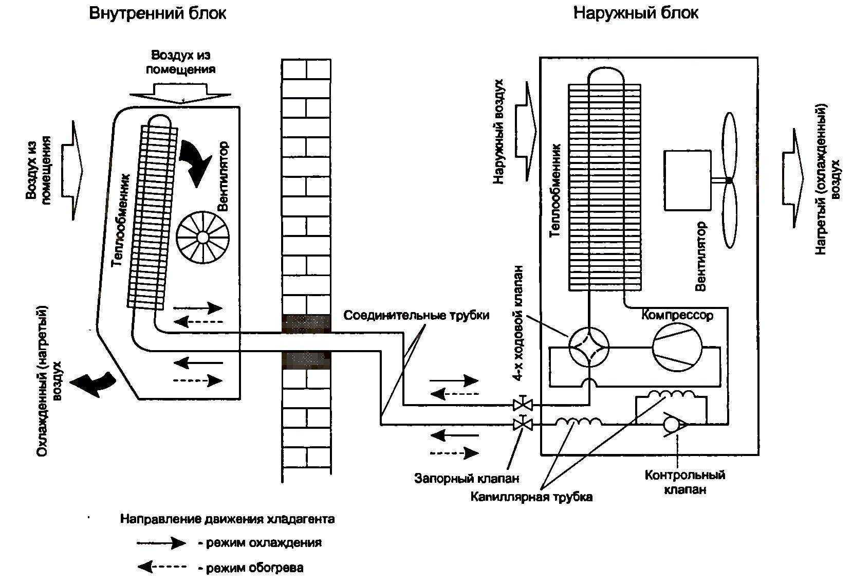Согласно закону сохранения энергии для того, чтобы обеспечить охлаждение воздуха в пространстве комнаты, необходимо обеспечить отвод тепла, полученного в результате фазового перехода. Чтобы понять, как устроен кондиционер, необходимо рассмотреть основные узлы, входящие в состав внутреннего и наружного блоков устройства.