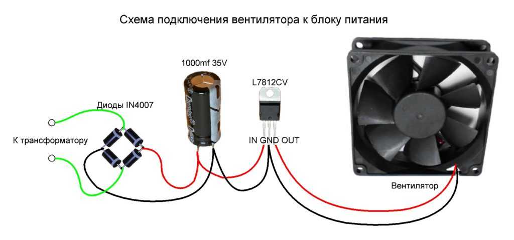 Радиатор начал быстро нагреваться, через 5 минут температура поднялась до 65С°. Поэтому при снятии больших нагрузок рекомендую поставить вентилятор. Подключить его можно по этой схеме. Диодный мост и конденсатор можно не ставить, а подключить стабилизатор напряжения L7812CV напрямую к конденсатору С1 регулируемого блока питания.