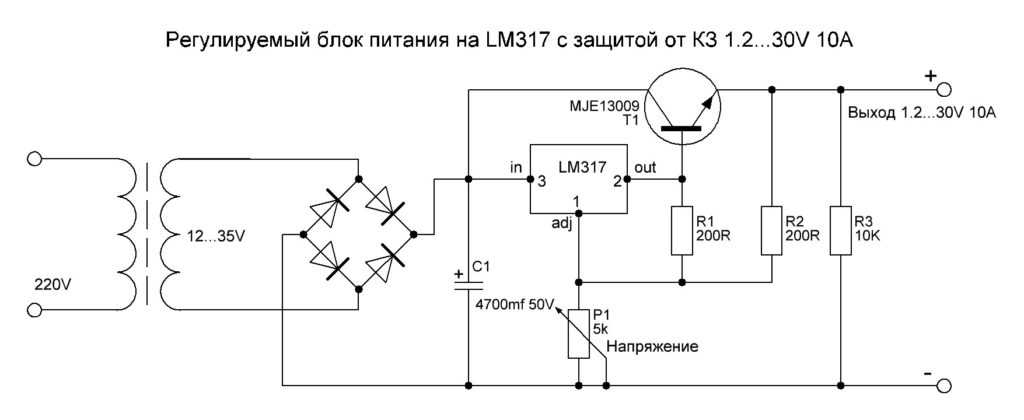 Схема регулируемого блока питания на стабилизаторе LM317 с защитой от КЗ