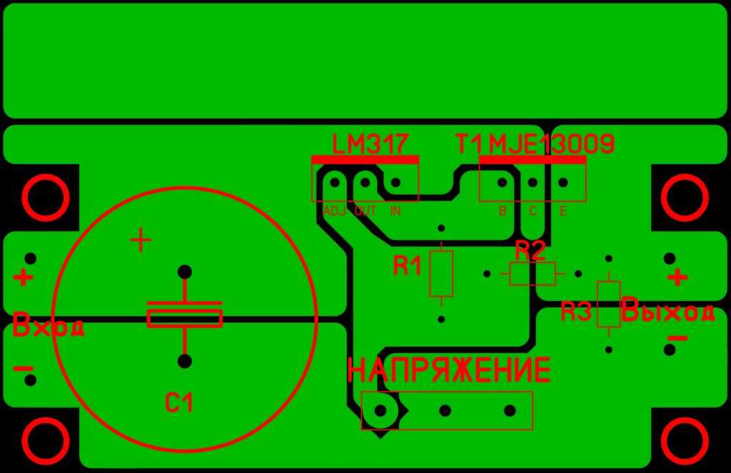 В зависимости от варианта изготовления корпуса LM317 подбирают расположение деталей на плате.
