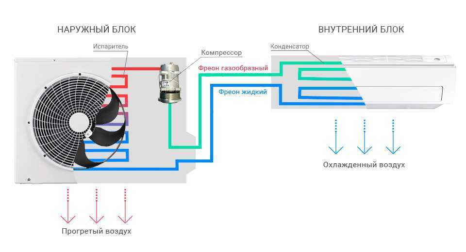 - У сплит-систем имеется внутренний и наружный блоки. При работе кондиционера в режиме охлаждения в наружном блоке в радиатор нагнетается фреон (хладагент). От давления он нагревается. Тепло от радиатора уходит в атмосферу.