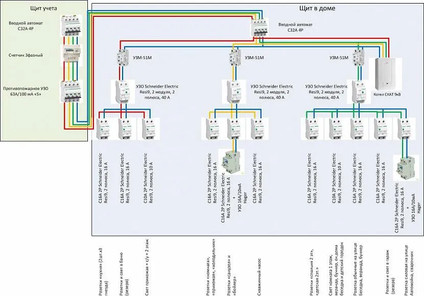 Если вы хотите защитить себя и дачу от утечек тока, то необходимо установить УЗО. Ниже представлена схема с одним общим защитным устройством. Если вы хотите большего, то смело в бой. Тут можно фантазировать до бесконечности.