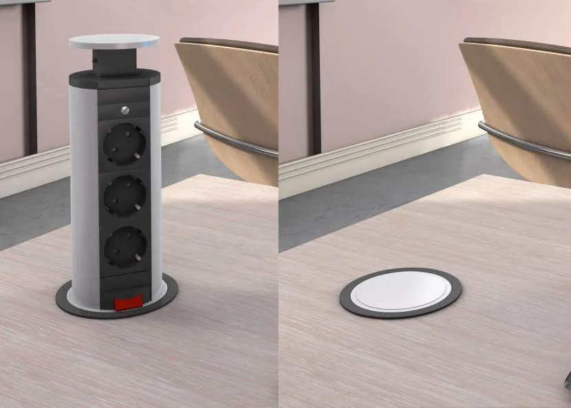 Выдвижные розетки – самый современный вариант. Как правило, это модуль из нескольких розеток, который прячется в столешницу или ящик и выдвигается нажатием. Помимо того, что это наиболее эстетичный вариант, он позволяет защитить розетки от попадания влаги и грязи, а также сохранить целостный рисунок кухонного фартука.