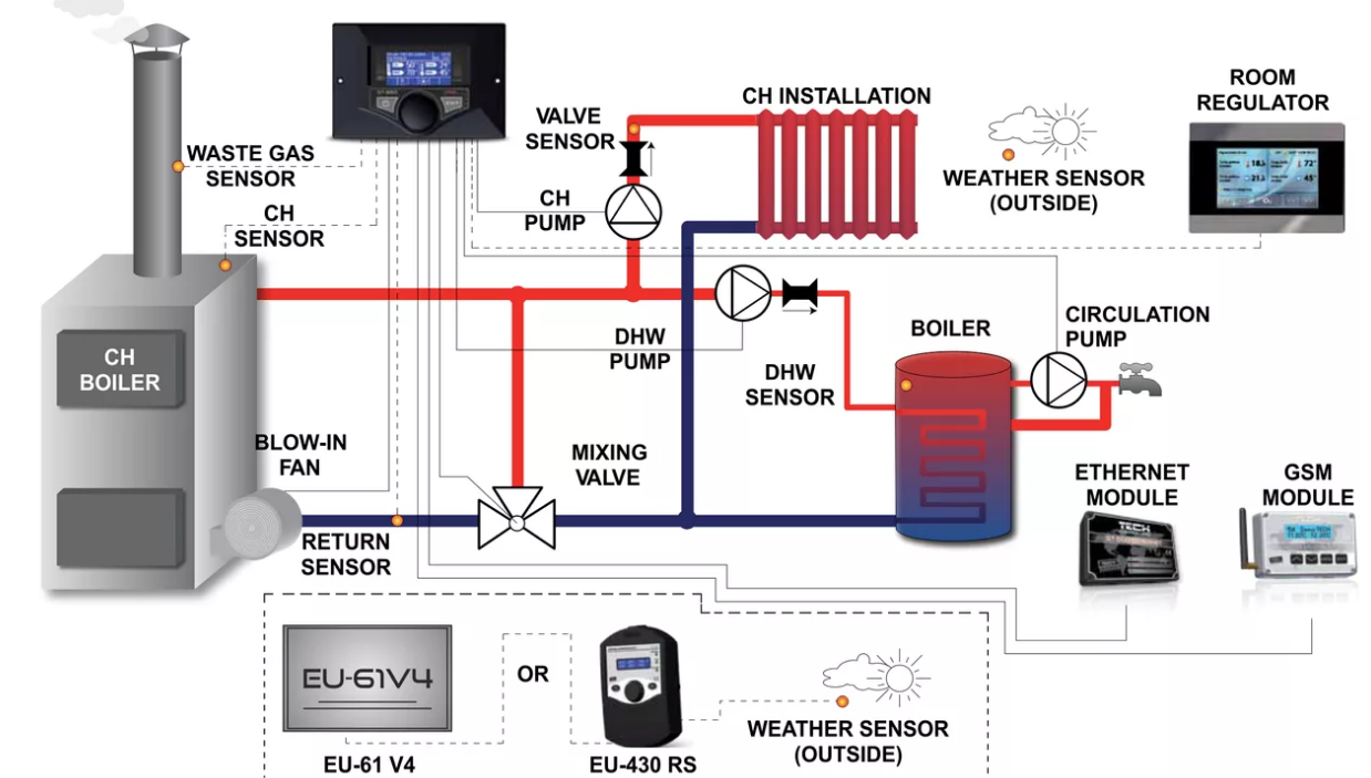 Может использоваться также система, включающая умный котел отопления. Он выполняет роль теплогенератора. Для регулировки мощности на него устанавливается блок контроля нагрева, анализирующий температуру на улице и в помещении. В соответствии с полученными данными контролирует подачу газа в горелке. Тем самым осуществляя экономию топлива и создавая комфортный микроклимат.