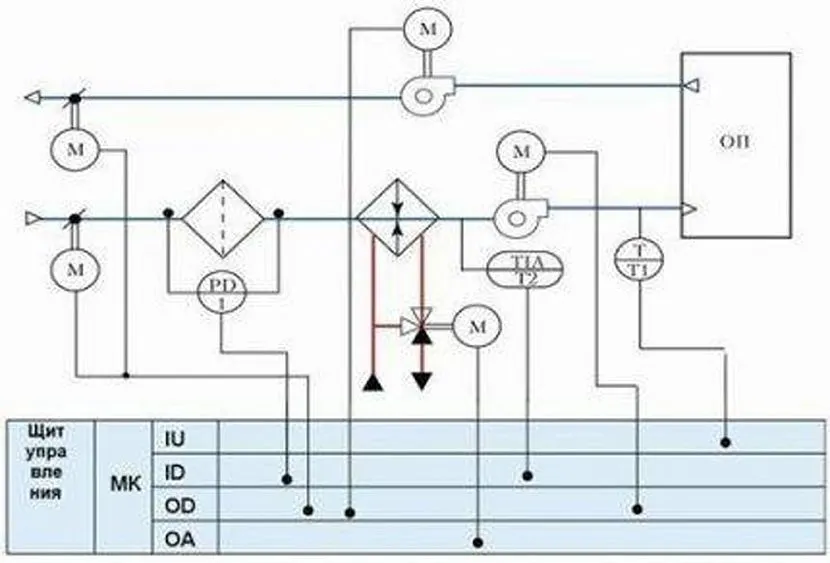 - ЩУ электроснабжением приточно-вытяжной вентиляции. Сюда включается рекуператор для поддержания заданной температуры входящих и выходящих газовых потоков. Существуют также модификации, на основе гликоля (CₙH₂ₙ(OH)₂), где в системе теплоснабжения применяется циркуляция незамерзающих жидкостей типа антифриза. Сюда также входит циркуляционный насос и автоблокировка от неконтролируемых температурных перепадов.