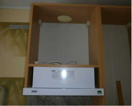 - В данном варианте крепиться она будет к днищу шкафа, в нем же, как и в потолочной полке проделывается отверстие под шланг из гофры. В этом случае все будет проводиться аналогично первому варианту, только здесь нужно будет постараться спрятать корпус под декоративной панелью, чтобы все выглядело максимально аккуратно;