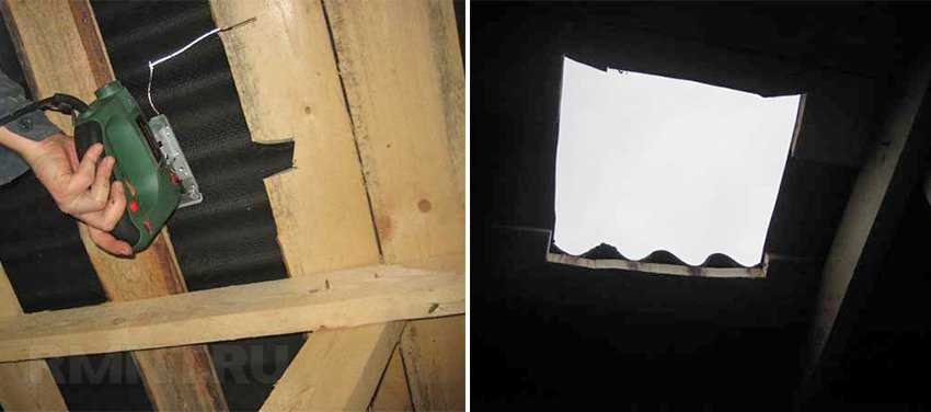 - Вырезают отверстие в кровельном покрытии. Чтобы вырез получился аккуратным, используют заводской шаблон и качественный режущий инструмент.