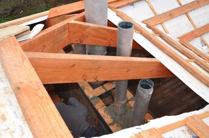 Если вентканалы могут проводиться сквозь кровлю с минимальным слоем обкладки, а то и вовсе без нее, то дымоходы нуждаются в дополнительной теплоизоляции от пирога кровли. Мы коснемся этого вопроса позже, пока же нужно сделать выбор между круглым и прямоугольным сечением колодца. Быстро и качественно через кровлю можно провести сложенный из кирпича колодец, он имеет наиболее подходящую геометрию. В одном колодце можно группировать и трубы вентиляции, и дымоходный канал.