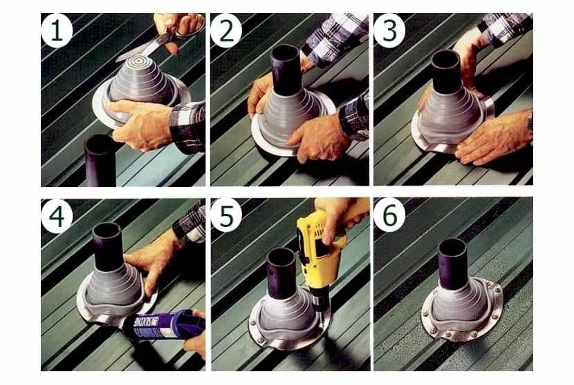 Когда отверстия вырезаны, на них последовательно устанавливают компоненты проходного узла с соблюдением технологии: тщательно герметизируют места примыкания, прочно закрепляют детали к обрешетке.