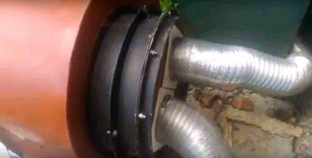 - вытяжную трубу закрепить на расстоянии 1,5-2 м от пола, а конец, выходящий наружу, расположить на 30-50 см выше кровли сооружения. Если монтируется труба на задней стенке, вентиляционный канал нужно дополнительно утеплить;